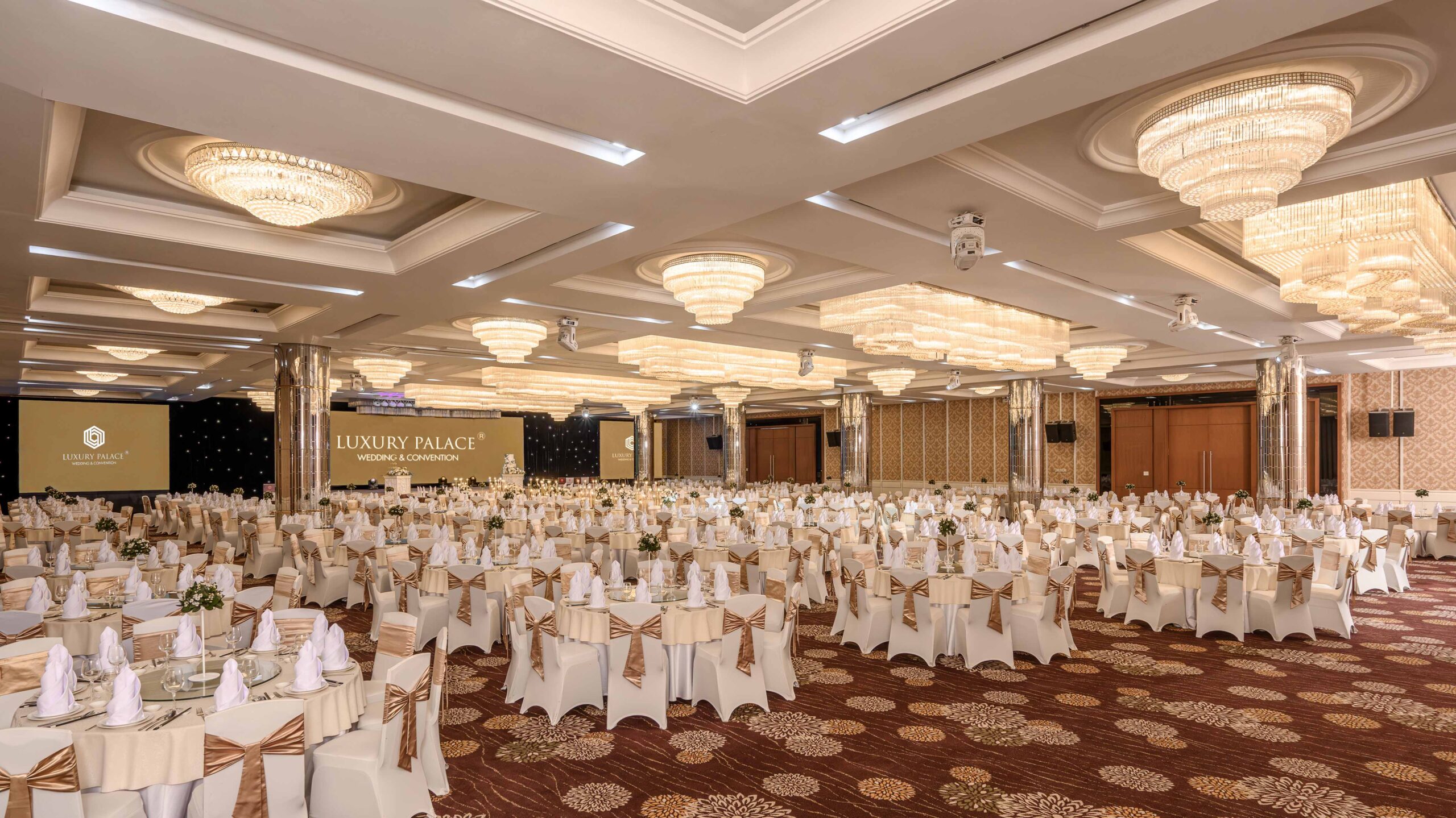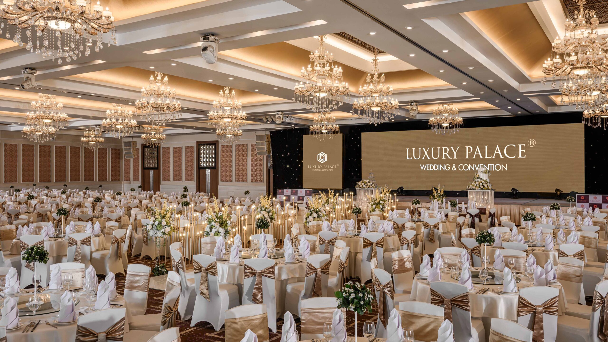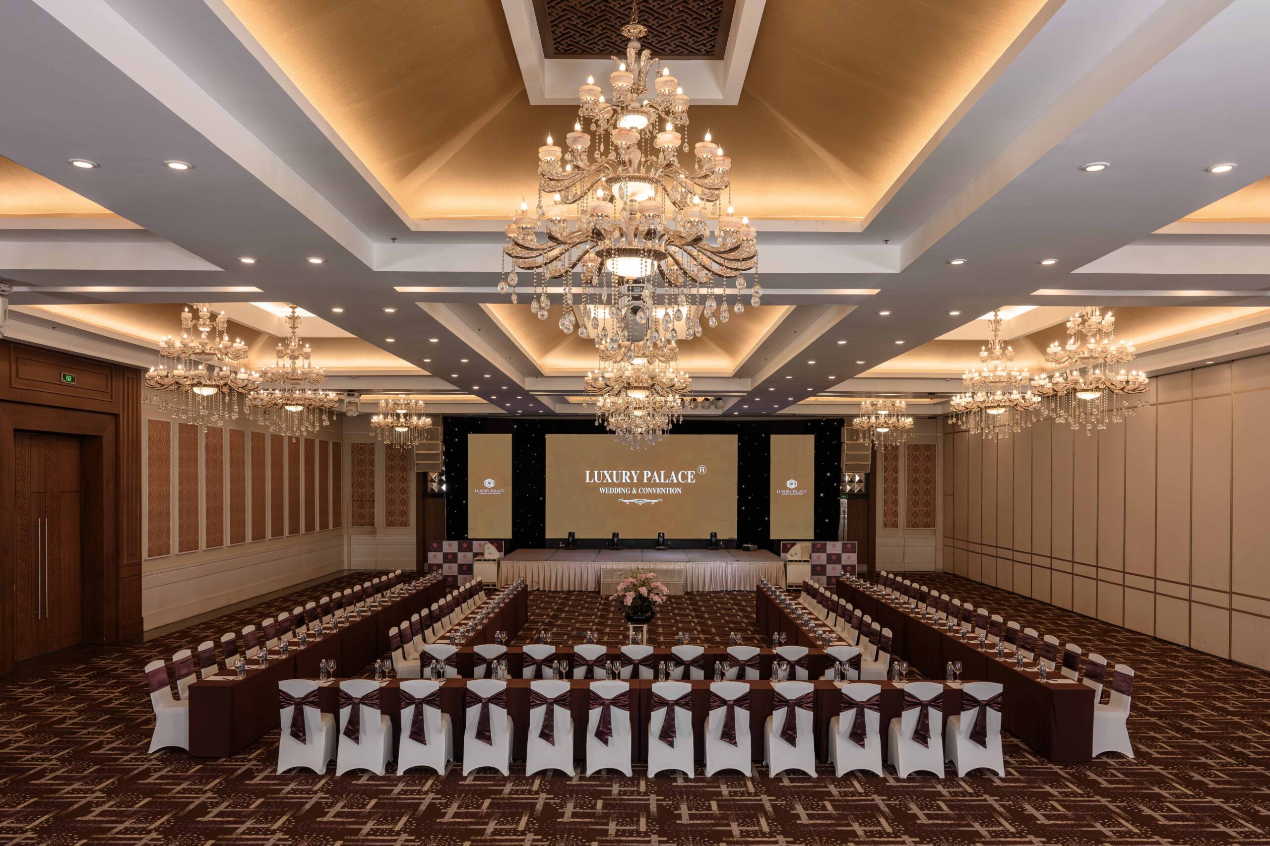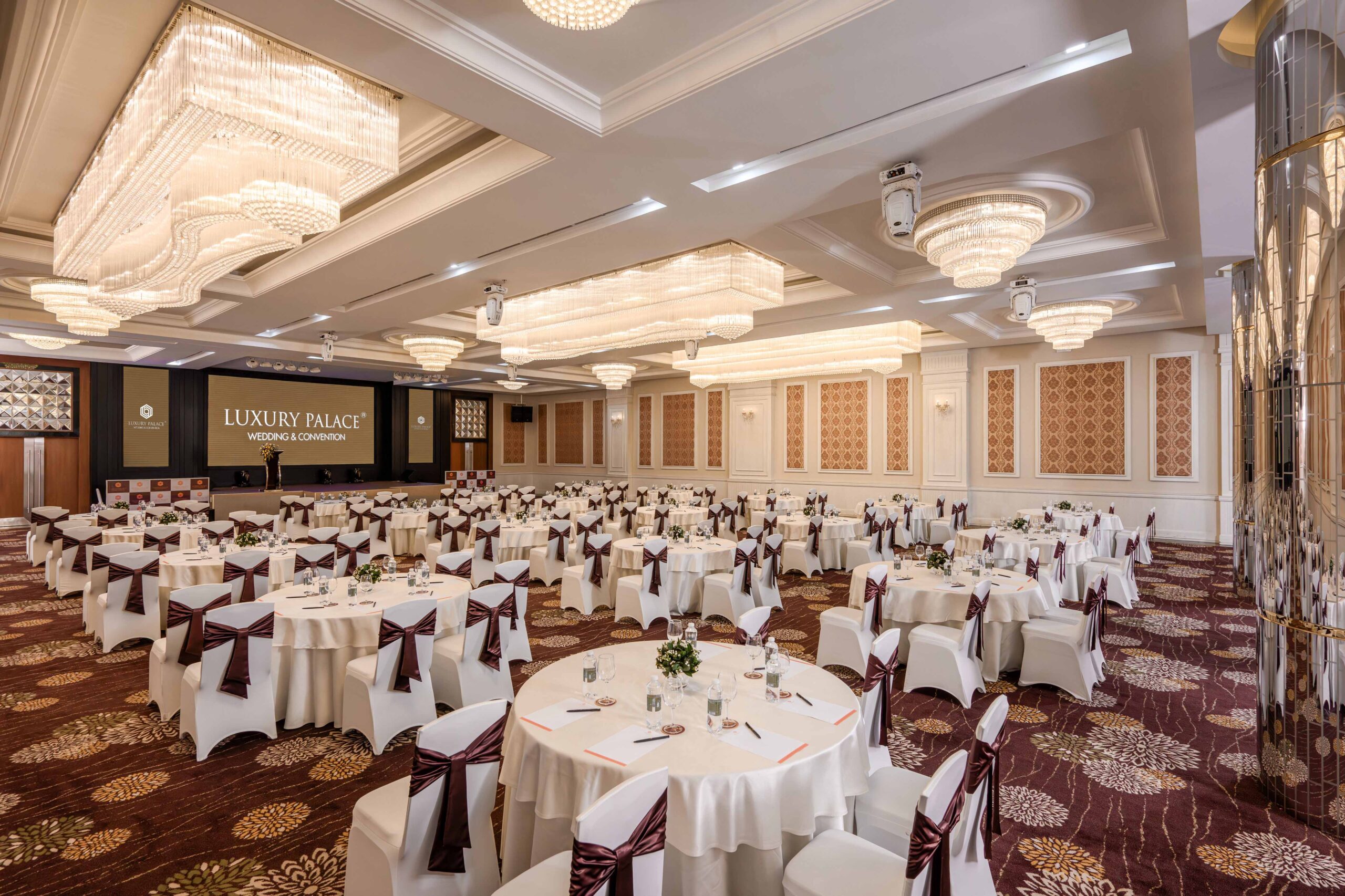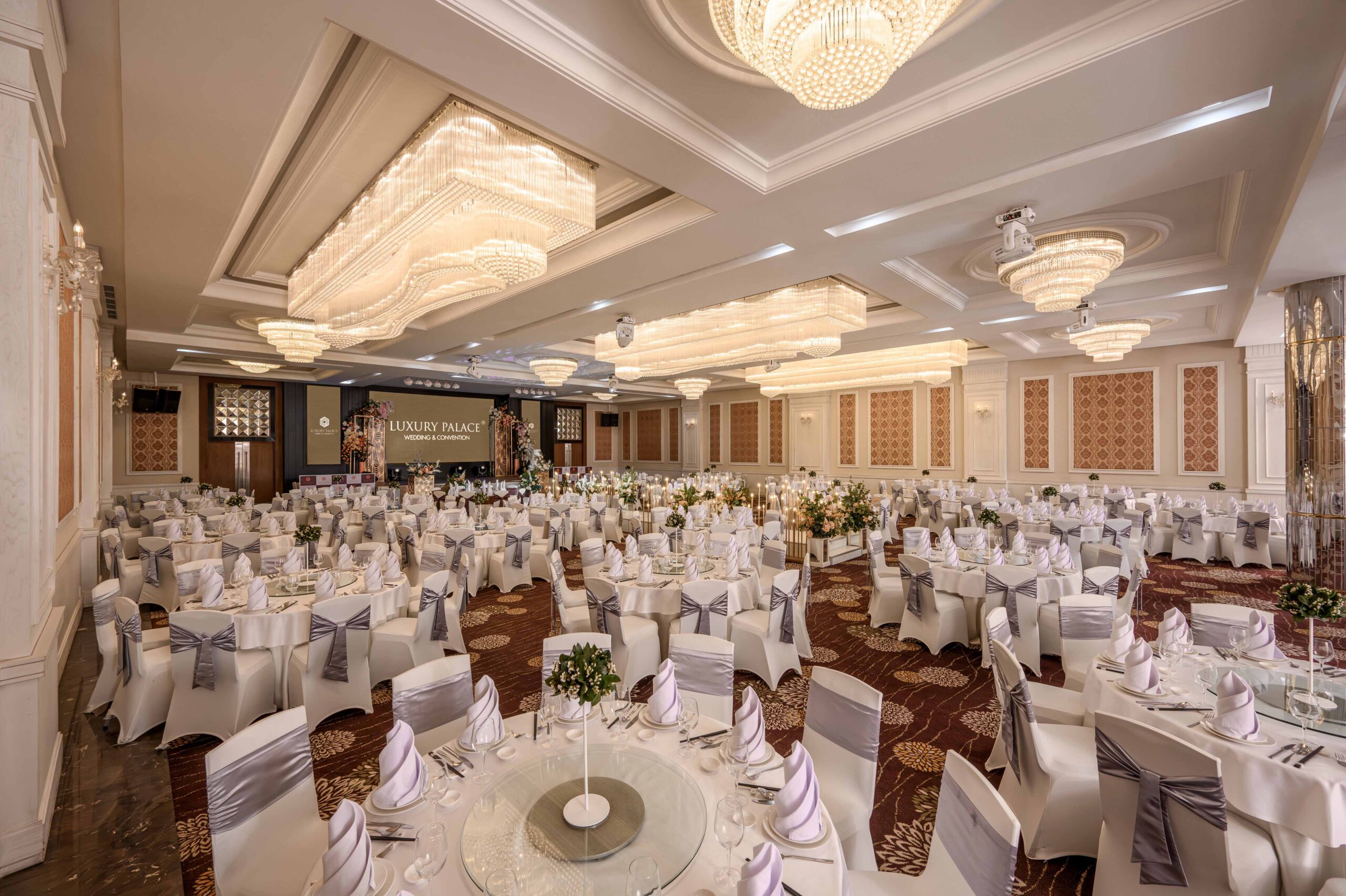 | Sảnh | Diện tích m2 | Kích thước DàixNgangxCao | Tầng | Bàn tròn | Rạp hát | Lớp học | Chữ U | Bán Nguyệt | Tiệc đứng | Tiệc tự chọn |