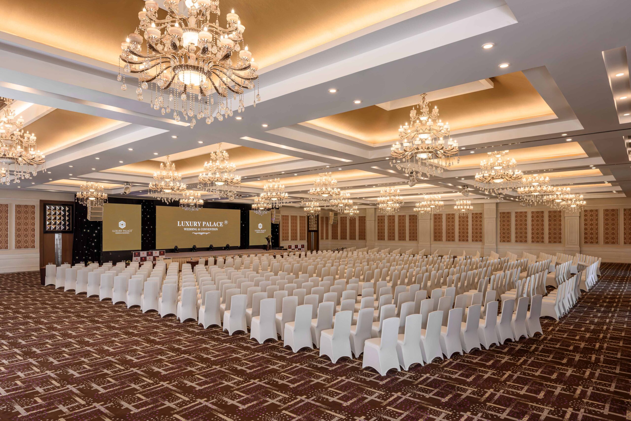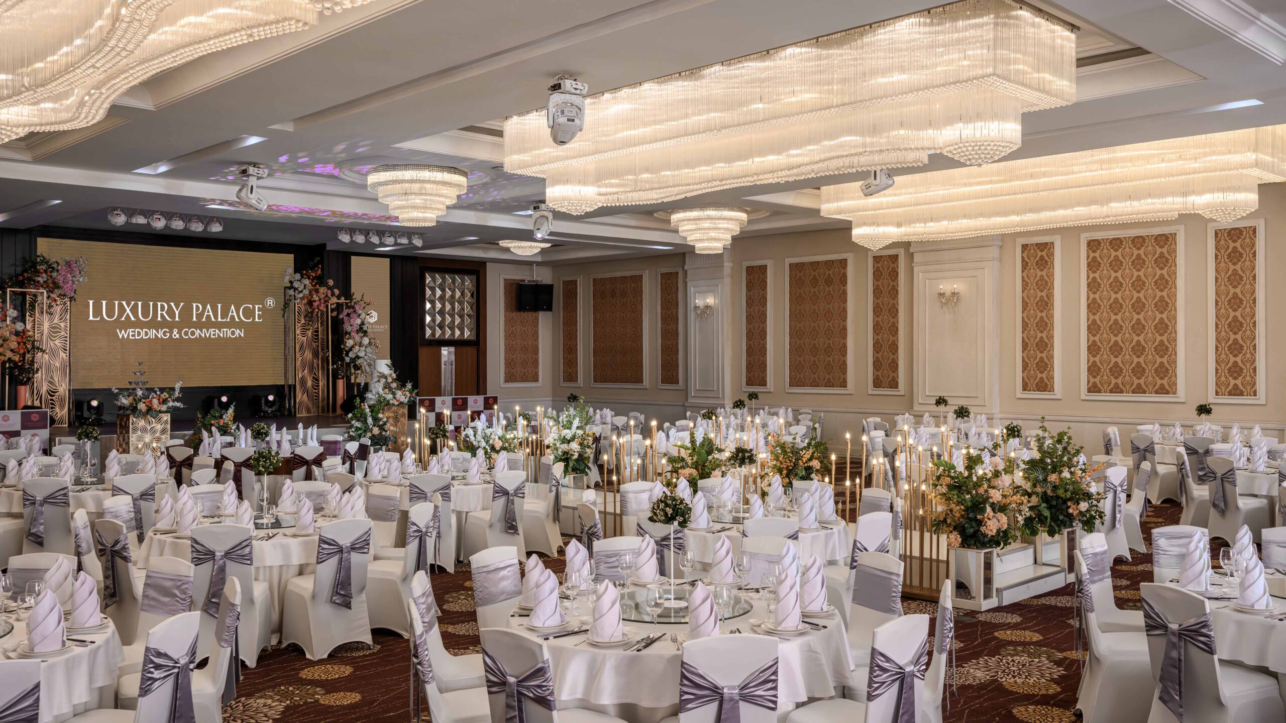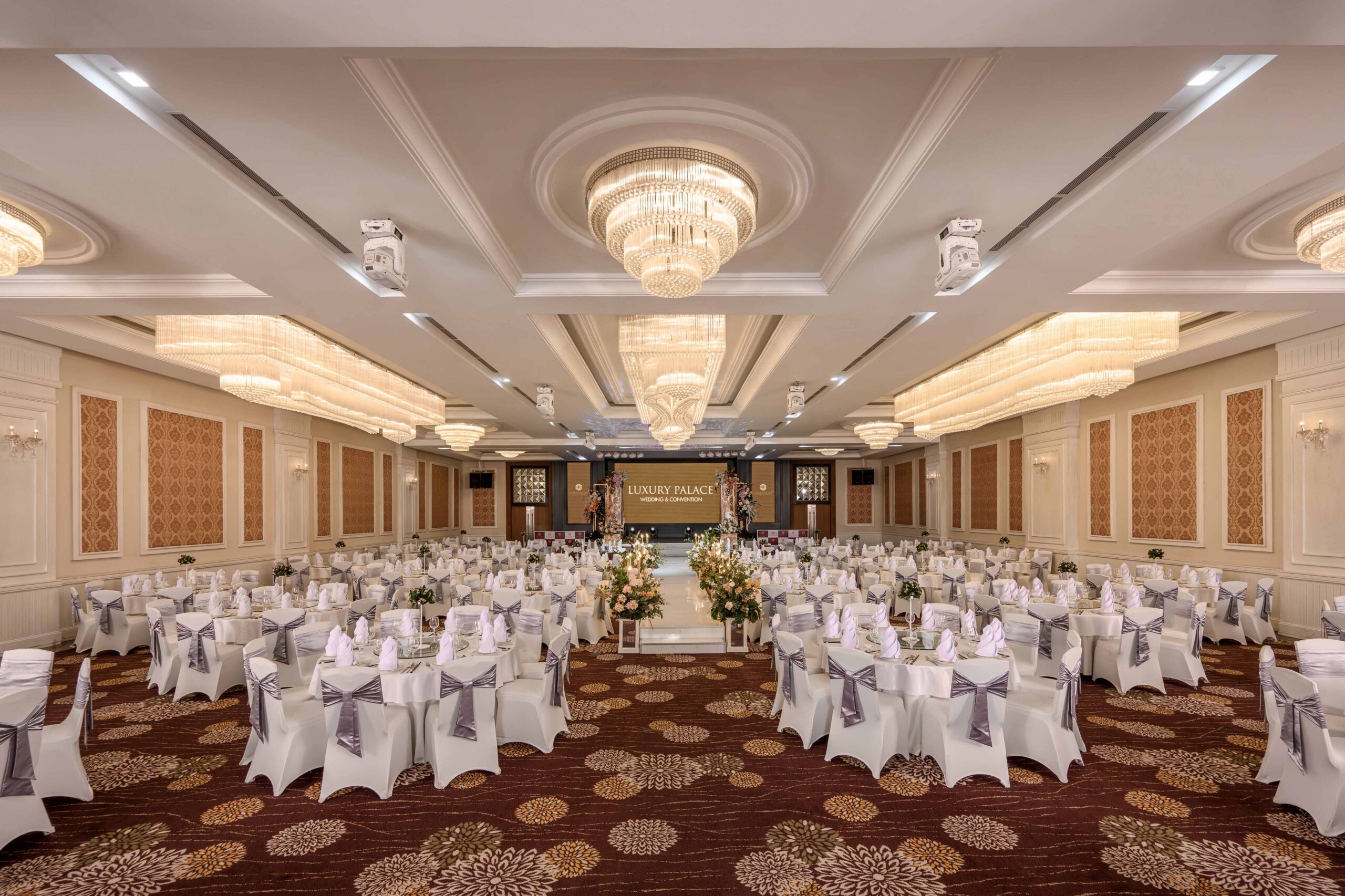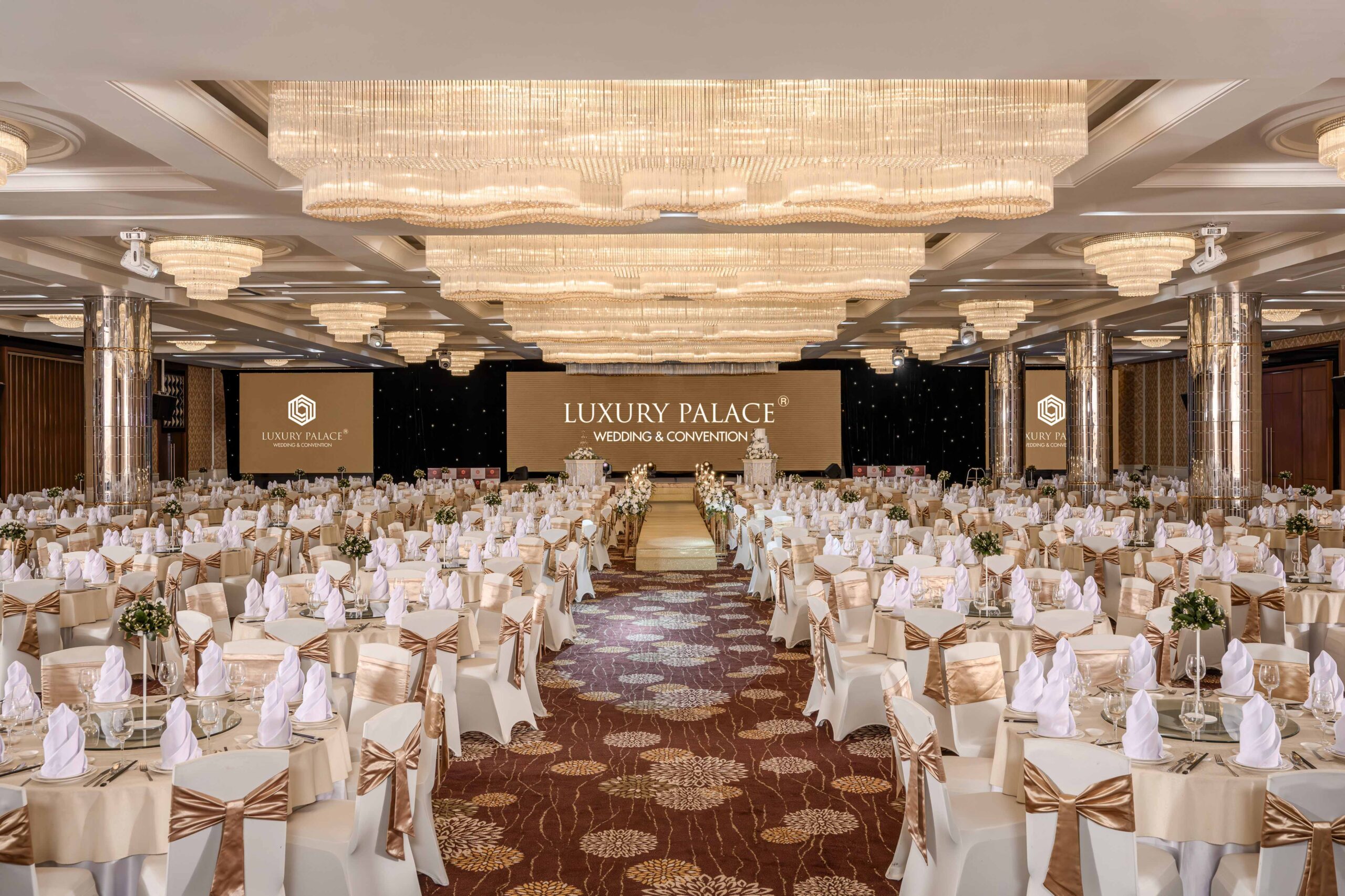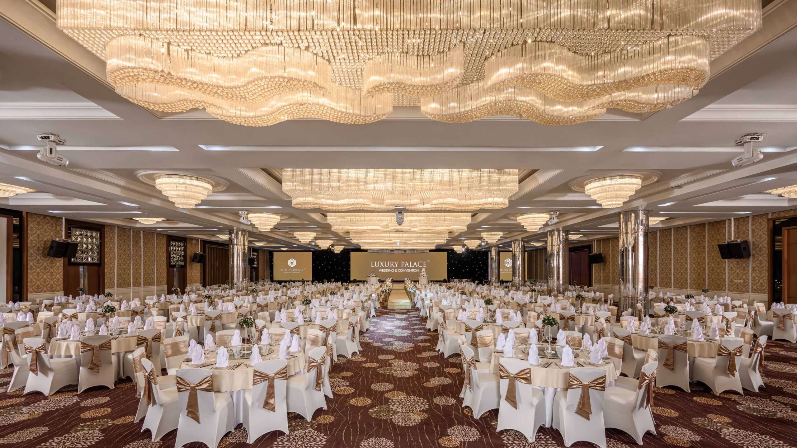 | Sảnh | Diện tích m2 | Kích thước DàixNgangxCao | Tầng | Bàn tròn | Rạp hát | Lớp học | Chữ U | Bán Nguyệt | Tiệc đứng | Tiệc tự chọn |