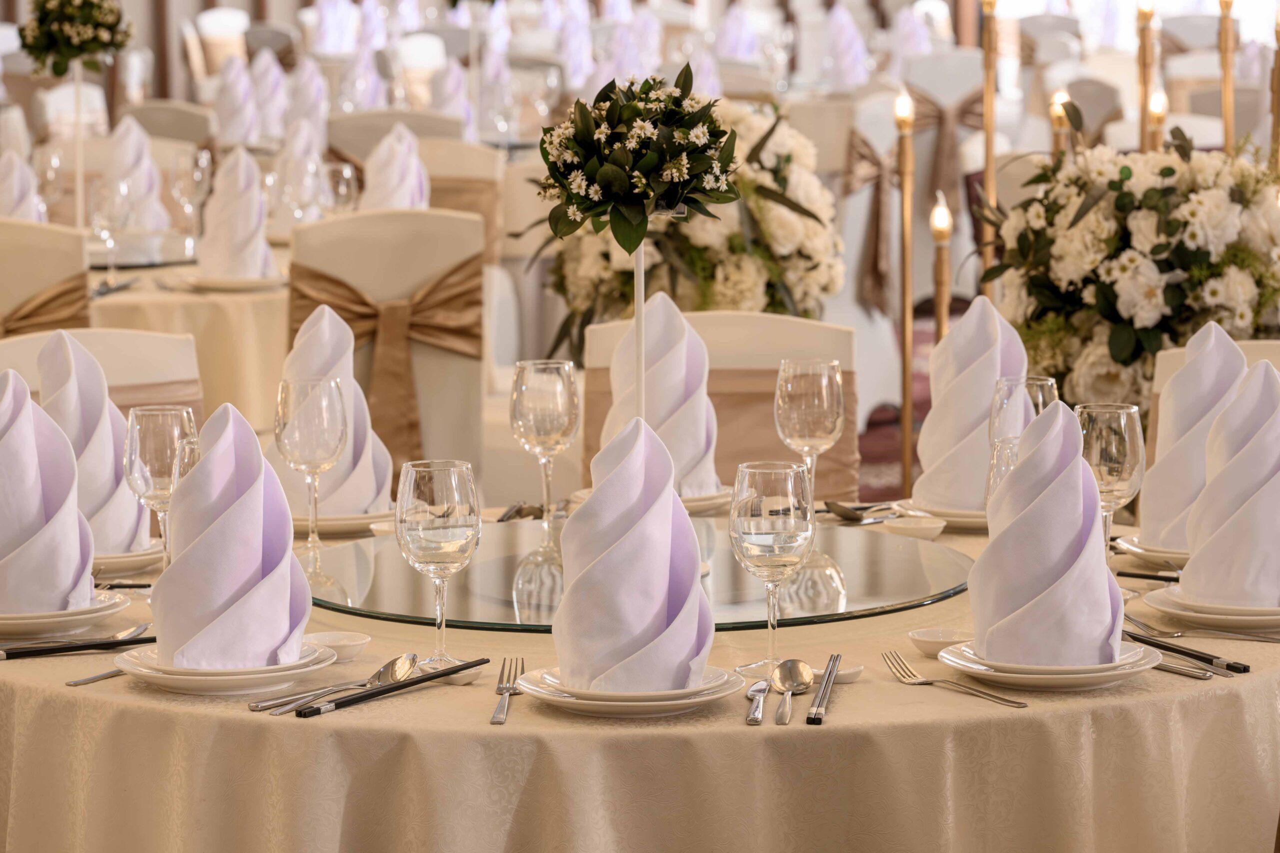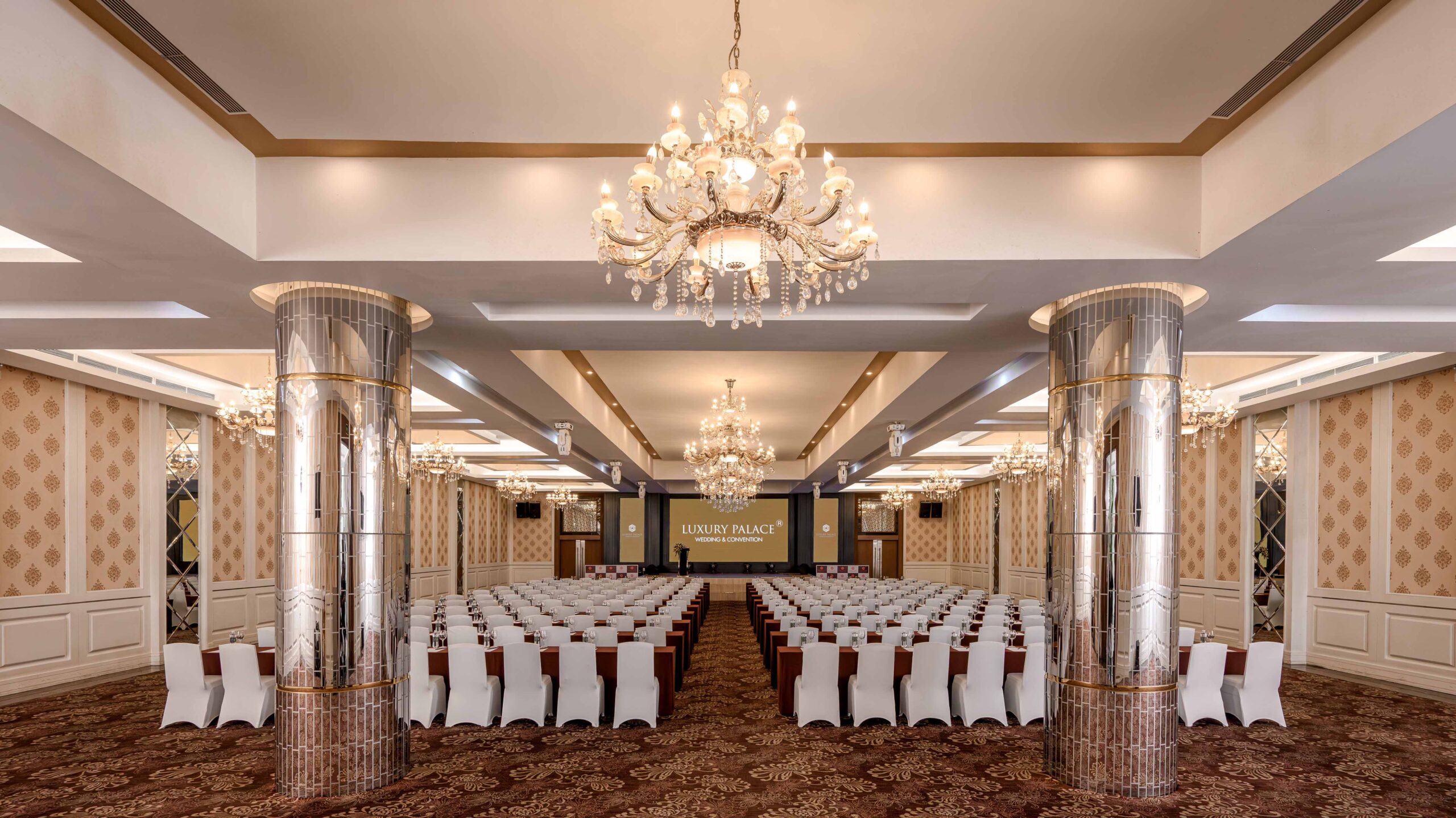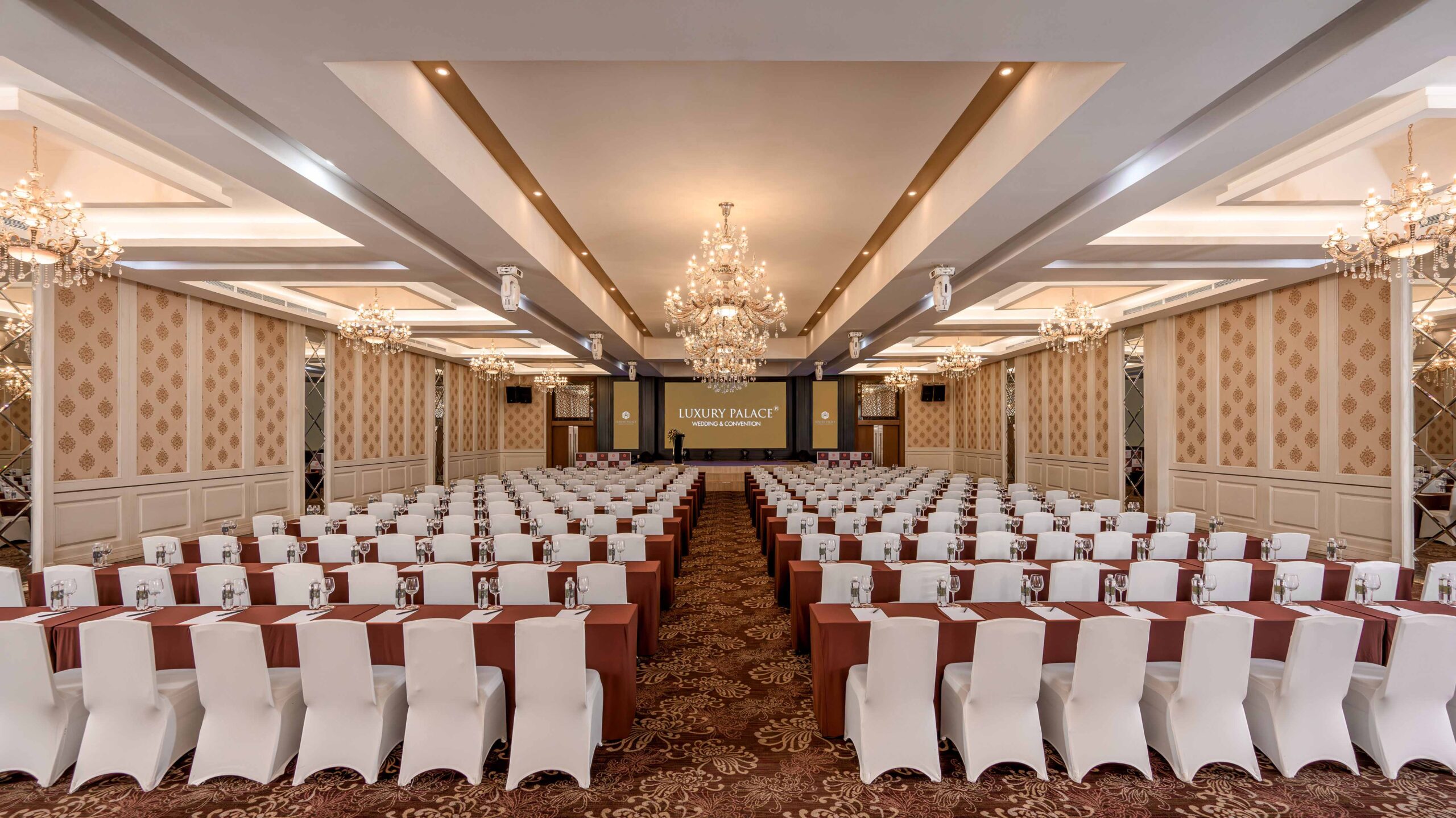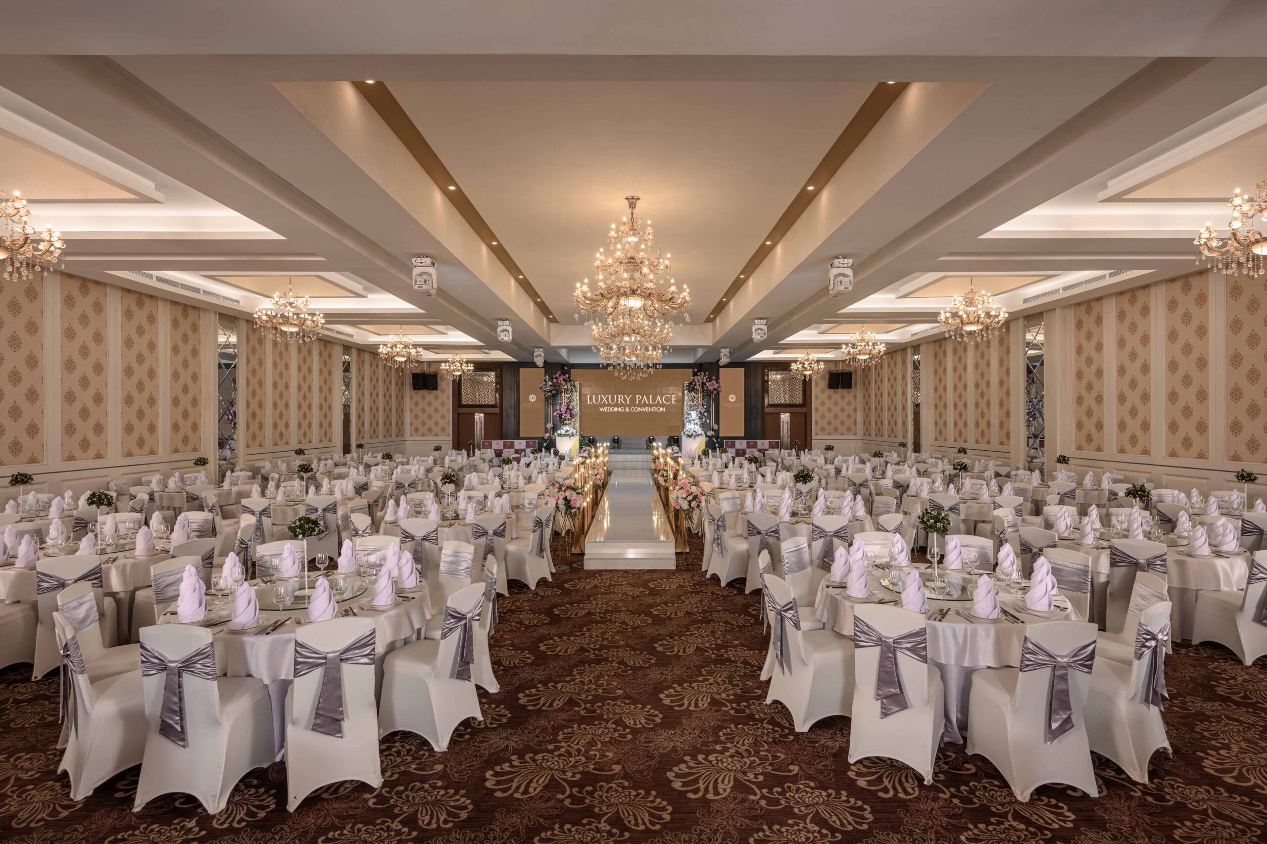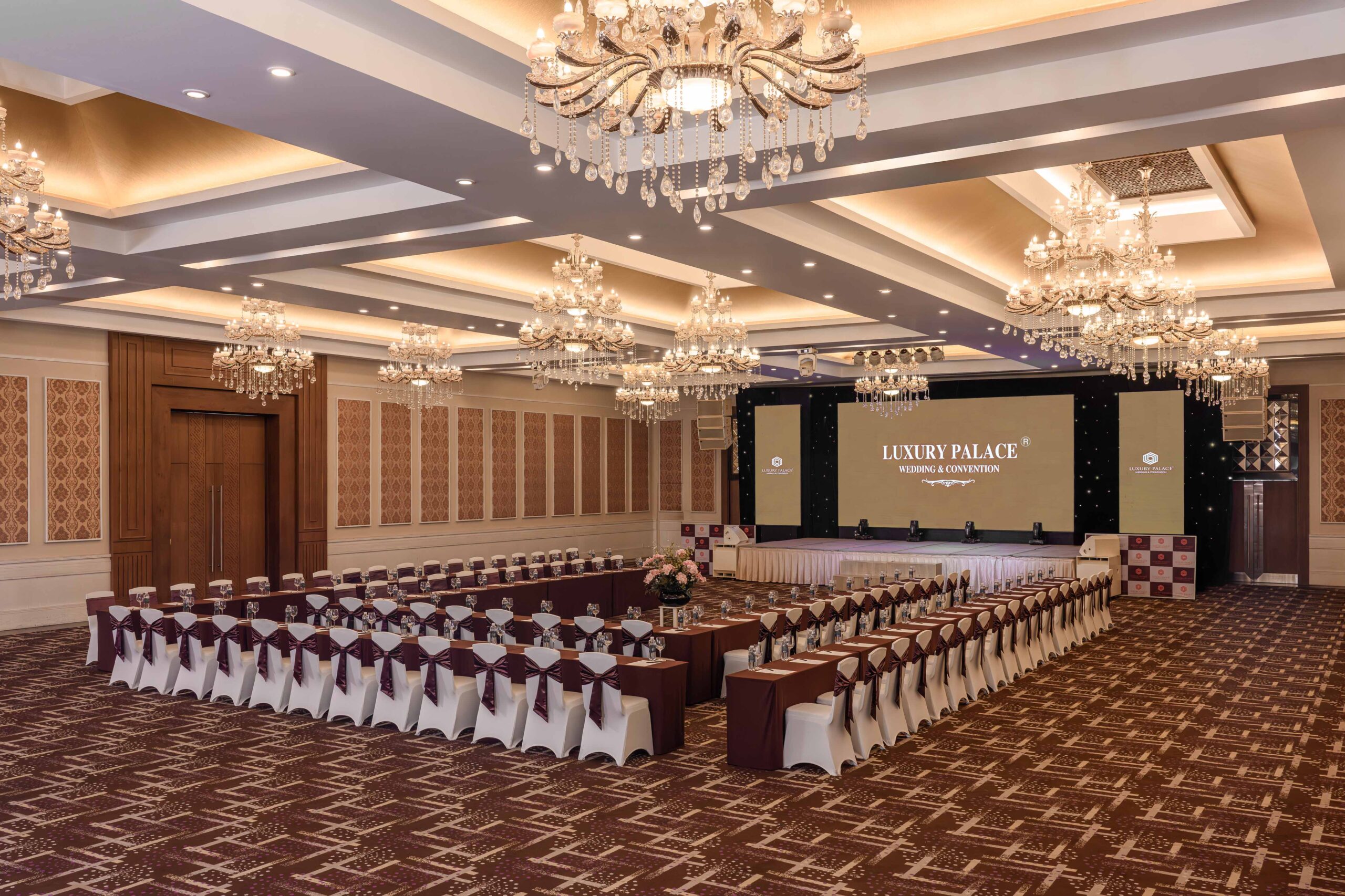 | Sảnh | Diện tích m2 | Kích thước DàixNgangxCao | Tầng | Bàn tròn | Rạp hát | Lớp học | Chữ U | Bán Nguyệt | Tiệc đứng | Tiệc tự chọn |